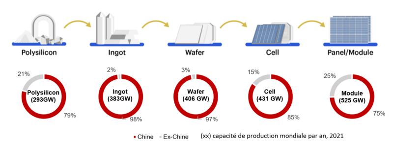 Prenant comme exemple le secteur du solaire (graph.1), la part de la Chine dans l’ensemble des étapes de fabrication des panneaux photovoltaïques à l’échelle mondiale est passée d’environ 50% en 2010 à plus de 80% aujourd’hui. On peut faire le même constat dans d’autres secteurs et conclure que la Chine domine l’ensemble des chaines d’approvisionnement des technologies clés à la transition comme les panneaux solaires, les véhicules électriques et le stockage d’énergie, entre autres. Graphique 1 : Dominance chinoise dans les étapes clés du processus de fabrication des panneaux solaires