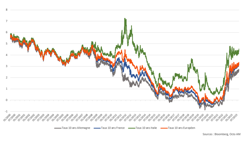 Cette semaine les marchés ont semble-t-il enfin commencé à prendre en compte cet environnement et on observe bel et bien une correction, lente mais certaine, de l’inversion de la courbe, non pas une rebaisse des taux courts comme le consensus l’anticipait il y a quelque mois, mais par une hausse des taux longs, comme en témoigne le graphe suivant sur lequel on peut observer que le taux 10 ans allemand se dirige avec persistance au-dessus du niveau des 3% qu’il avait quitté en 2010-2011, lors de la crise des périphériques… Nous ne sommes pas loin de penser qu’il pourrait même avoisiner les 4% à un horizon pas si lointain mais chaque chose en son temps et n’oublions pas que derrière l’Allemagne, le troupeau des Etats Européens suit avec ses primes de crédit parfois élevées. Ainsi l’Italie a déjà dépassé le seuil des 4.5% et la France celui des 3.2%… D’un point de vue européen consolidé, le taux moyen à 10 ans des pays européens est ainsi relativement proche du taux de référence de la BCE et la pente n’est pas si inversée que cela… Mais les Euro-obligations qui avaient connu un écho particulier lors du Covid sont maintenant un lointain souvenir et les tensions énergétiques et politiques ont repris le dessus sur la logique budgétaire, monétaire et fiscale.