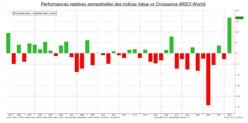 Le premier semestre 2022 a été marqué par de fortes baisses sur les marchés de taux et d’actions partout dans le monde. Mais cette chute masque un autre phénomène tout aussi frappant, la très forte rotation de style à l’oeuvre sur les marchés actions.