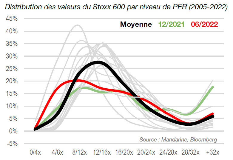 Le graphique ci-dessous présente la répartition des valeurs du Stoxx 600 en fonction de leur niveau de PER chaque année depuis 2005. Il montre (courbe verte) que l’an dernier la proportion de sociétés très chères (plus de 20 fois le PER, partie droite du graphique) était très supérieure à la normale. Une petite partie de ces sociétés apparaissent ainsi en raison de profits très faibles (répercussion de la crise du COVID sur le secteur du transport et du tourisme notamment) mais l’essentiel reflète cependant bien ce qu’un gérant Value qualifierait de « bulle de valorisation » lié au contexte de taux (anormalement) bas. On constate cette année (courbe rouge) le dégonflement total de cette bulle.