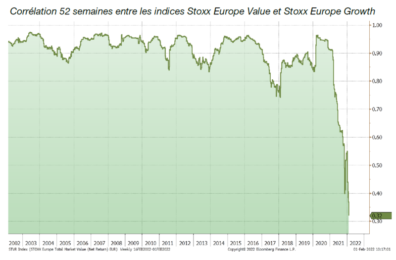 Sans surprise, ces écarts de performances extrêmes et quasi-quotidiens ont entrainé une forte baisse de la corrélation entre les deux styles :