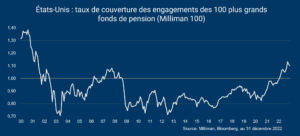 En 2022, la valeur de ces actifs a baissé de 18%, en ligne avec le fort recul des marchés actions et des marchés obligataires. Toutefois, en parallèle, l’effet de la hausse des taux sur le taux d’actualisation a fait baisser leur passif de 27%*. Ce taux d’actualisation, correspondant peu ou prou au rendement à maturité des obligations d’entreprises de bonne qualité, est passé de 2,8% à 5,2%.