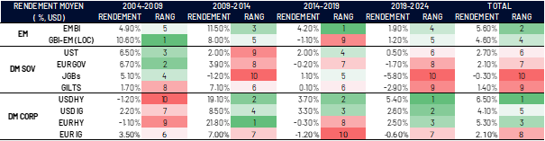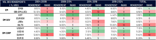 Evolution des rendements et de la volatilité des rendements des différentEs classes d’actifs taux sur longue période