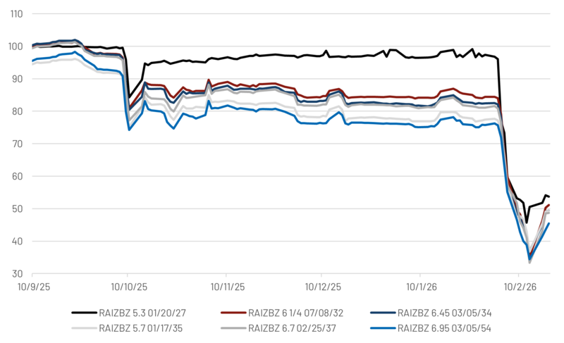 Des opportunités qui nécessitent évidemment d’être approchées avec prudence, circonspection et humilité, tant il est vrai que les chocs idiosyncrasiques peuvent être, sur cette classe d’actifs, encore plus violents que sur le High Yield (nous reviendrons plus spécifiquement sur le HY dans notre prochaine publication) – on pourra en prendre pour exemple l’effondrement récent de l’émetteur brésilien Raizen (que nous n’avons jamais détenu en portefeuille), dégradé de 7 crans le 9 février dernier par les trois principales agences de notation (cf. graphique ci-dessous).