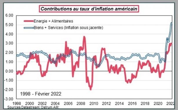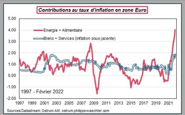 – Une inflation organique aux USA contre une inflation essentiellement importée en Eurozone, comme en témoigne ce graphique emprunté à nos confrères de Ostrum AM. Notons ici qu’une inflation importée par des matières premières qu’on a rien pour remplacer, ne peut clairement pas créer de spirale inflationniste ni de croissance, mais simplement une inflation à la production dans un premier temps, puis une baisse des marges, puis une réduction du rythme de croissance des entreprises et donc des pays.